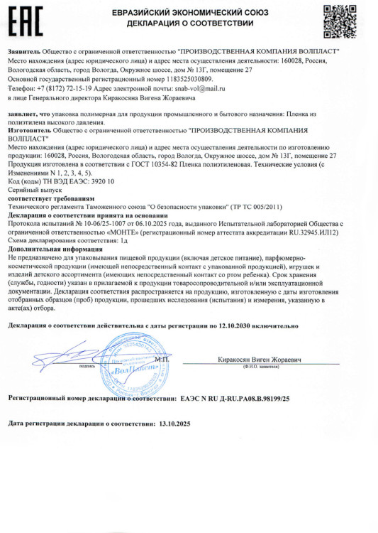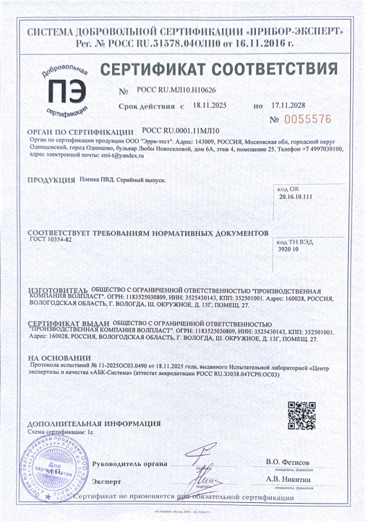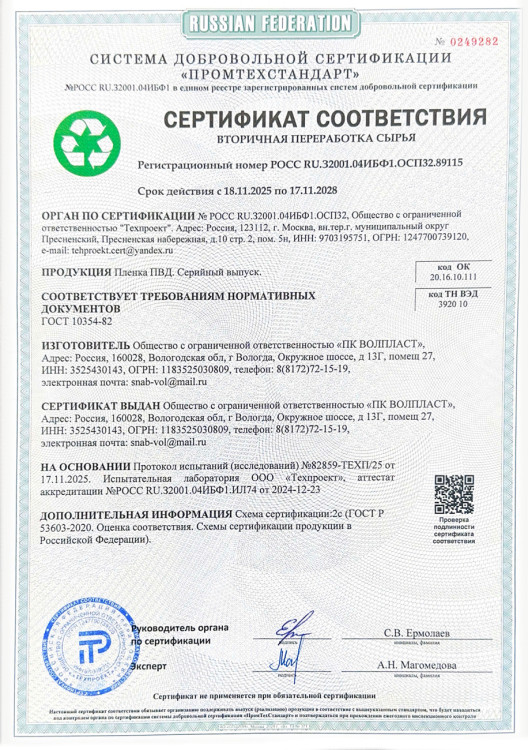 Сертификат соответствия на пленку ПВД ГОСТ 10354-82